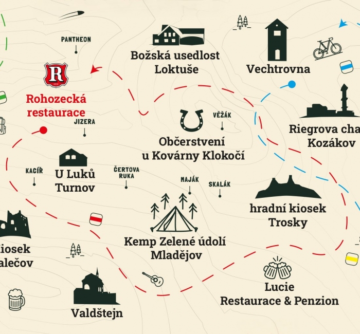 Na mapě najdete síť zapojených podniků a zastávek, které tvoří přirozené body celé stezky. Každé místo má své kouzlo – někde se zastavíte na rychlé pivo, jinde si dáte oběd, výhled nebo delší odpočinek.