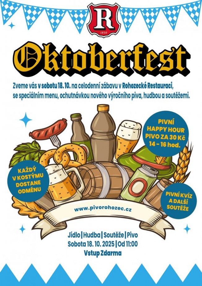 Pivovar Rohozec vás srdečně zve na OKTOBERFEST v Rohozci, který proběhne v sobotu 18. října 2025 přímo v Rohozecké restauraci. Čeká vás den plný piva, dobrého jídla, soutěží a hudby.