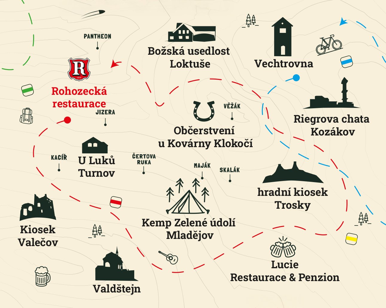 Napříč regionem jsme vytvořili síť hospod, restaurací a zastavení, která vás zavedou přímo na místa, jež inspirovala názvy našich piv. Každá zastávka má svůj příběh – a právě ten můžete objevovat společně s přáteli, rodinou nebo klidně sami. Nejde jen o pivo, ale o společný zážitek, pohyb a poznávání krajiny, která stojí za tím, co pijete.